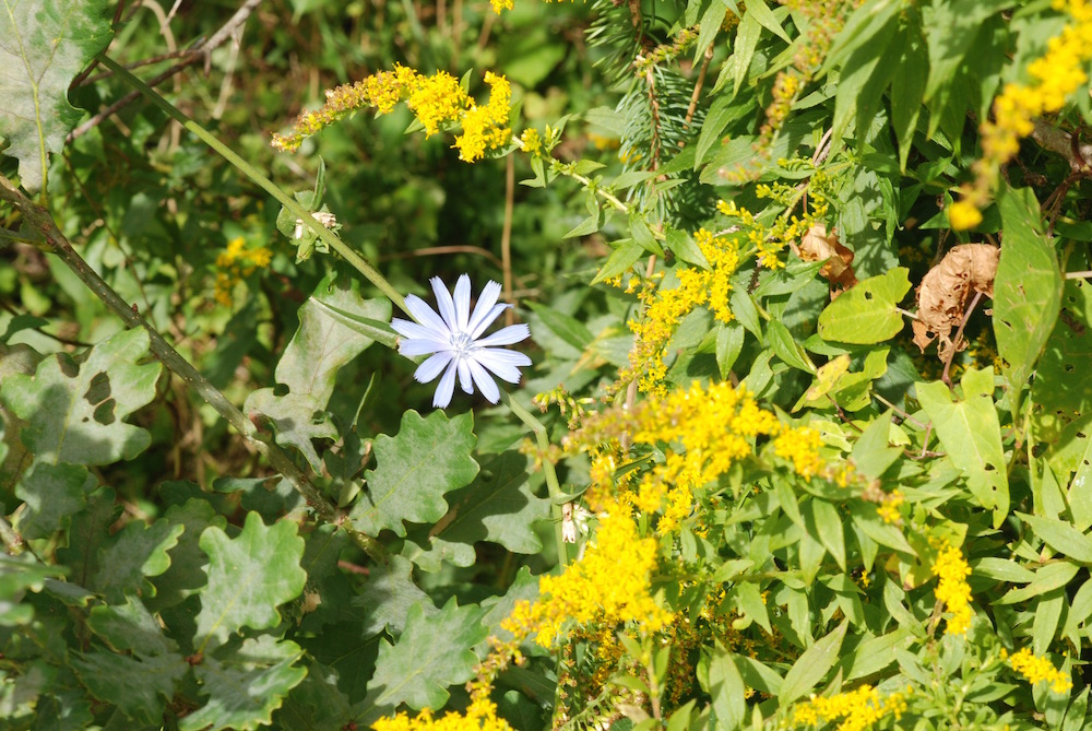 Chicory. We see this in New England often on the side of the road, but not usually this late in the season. It was surprising to see one little bloom though. In real life, this was a very bright blue.